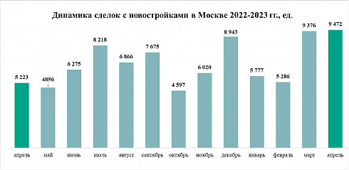 В апреле 2023 года Росреестр Москвы зарегистрировал 9,5 тыс. договоров участия в долевом строительстве (ДДУ) жилья, что на 1% больше, чем в марте 2023 года. В то же время по сравнению с апрелем 2022 года количество ДДУ в Москве увеличилось на 81% – год назад, в апреле, Росреестр зафиксировало только 5,2 тыс. ДДУ. Апрельский показатель 2023 году на рынке строящегося жилья – самый высокий за последние 12 месяцев, предыдущий рекорд был установлен в марте 2023 года (9,4 тыс. ДДУ).