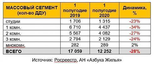 На долю студий и однокомнатных квартир по итогам первых шести месяцев 2020 года пришлось 44% от общего объема продаж, а на долю двухкомнатных квартир – 33%, что аналогично показателям первого полугодия 2019 года.