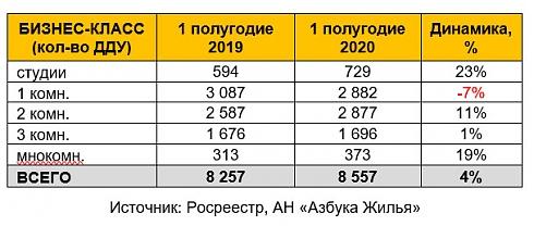 В бизнес-классе обратная ситуация – продажи выросли по всем типам квартир за исключением однокомнатных квартир, где количество ДДУ снизилось на 7% по сравнению с первым полугодием 2019 года. При этом количество проданных студий выросло на 23% до 729 лотов. Количество реализованных многокомнатных квартир возросло на 19% до 373 лотов, а двухкомнатных квартир – больше на 11% до 2 877 лотов.
