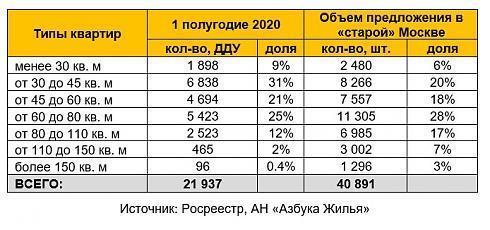 По итогам первого полугодия 2020 года объем продаж на первичном жилом рынке «старой» Москвы снизился на 18% по сравнению с первым полугодием 2019 года и составил 21,3 тыс. ДДУ. В разрезе по классам динамика не единообразна. В массовом сегменте по итогам полугодия снижение составило выше среднего показателя – уменьшение на 28% по сравнению с аналогичным показателем 2019 года, а в бизнес-классе, наоборот, в первом полугодии 2020 года количество заключенных ДДУ выросло на 4%, несмотря на все кризисы и пандемию. Специалисты Департамента консалтинга и аналитики агентства недвижимости «Азбука Жилья» проанализировали продажи за прошедшие полгода с точки зрения комнатности и площади проданных лотов на первичном рынке в границах «старой» Москвы.