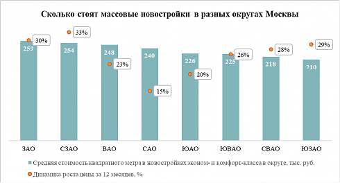Только за прошедший месяц в среднем показатель цены во всех округах увеличился на 4%. За 12 месяцев сильнее всего подорожали новостройки в СЗАО – на 33%. Затем следует ЗАО (30%), ЮЗАО (29%), СВАО (28%), ЮВАО (26%), ВАО (23%), ЮАО (20%) и САО (15%). В абсолютном выражении квадратный метр в разных округах стал дороже на 30-60 тыс. рублей за год. В целом же по рынку новостроек Москвы стоимость массовых новостроек увеличилась за года на 25% – с 188 тыс. руб. за кв.м до 234 тыс. руб. за кв.м.