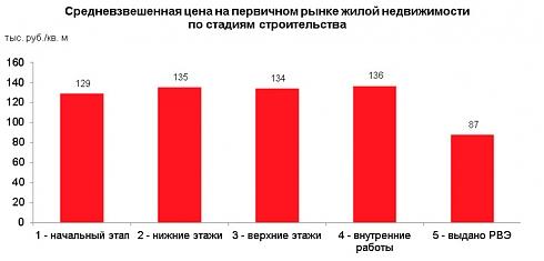 За квартал в присоединенных территориях цены выросли практически по всем стадиям строительства, исключения составили только новостройки на этапе возведения нижних этажей. При этом самый высокий показатель зафиксирован в комплексах, в которых проводятся внутренние работы – 136 тыс. руб./кв. м, а самый низкий – в уже готовых проектах (87 тыс. руб./кв. м).