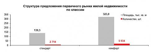 Первичное предложение Новой Москвы представлено только в стандарт- и комфорт-классах, новостройки бизнес-класса за квартал были полностью реализованы. При этом в проектах сегмента комфорт в продаже находится 323,8 тыс. кв. м, в «стандартных» комплексах показатель составляет 139,3 тыс. кв. м.