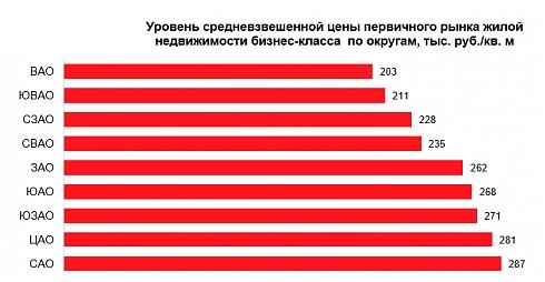 Больше всего за год увеличилась стоимость в новостройках, расположенных в СВАО (9,7%), сейчас показатель находится на уровне 235 тыс. руб./кв. м. При этом минимальный уровень цен относится к ВАО (203 тыс. руб./кв. м), а ценовой максимум среди округов остается за САО (287 тыс. руб./кв. м) – в данной локации ряд проектов по своим качественным характеристикам приближены к премиум-классу, и значительный объем в них находится на высокой стадии строительства.