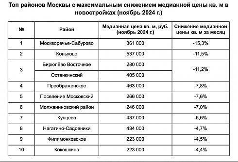 В ноябре больше всего медианная цена квадратного метра на первичном рынке снизилась в Москворечье-Сабурово, Коньково, Бирюлево Восточном и Останкинском районах. Ощутимый рост цен в новостройках отмечается только в районах с высокобюджетными предложениями – в центре и на западе Москвы.
