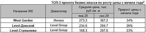 Квартиры сегмента бизнес в 2020 году были наиболее интересны для инвесторов, поскольку такие вложения являются оптимальными с точки зрения динамики цен и возможности их быстрой реализации. Так, например, среди проектов бизнес-класса, присутствовавших на рынке с начала года, максимальный прирост цены отмечен в ЖК West Garden (34%), Level-Донской (26%) и Level-Стрешнево (23%).
