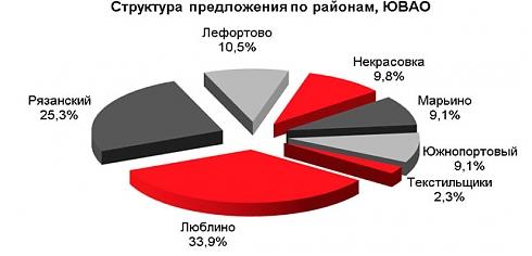 Наибольший объем предложения сосредоточен в районе Люблино – на него приходится 34%, при этом значительное влияние на данный показатель оказывает проект «Люблинский Парк». Существенные доли также зафиксированы в районах Рязанский – 25% и Лефортово -10,5% от общего объема предложения в округе.