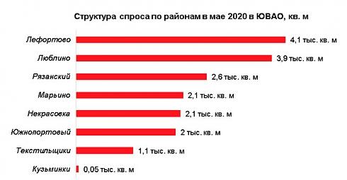 Юго-Восточный округ занимает 15% от общего объема реализованного жилья в столице, при этом наибольшим спросом пользуется жилье в Лефортово, в котором было реализовано 4,1 тыс. кв. м (13%), а также в районах Люблино и Рязанский, доли которых составляют 22% и 14% соответственно, в них в мае продано 3,9 и 2,6 тыс. кв. м соответственно.