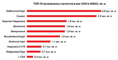 По итогам мая самым востребованным комплексом стал «Люблинский Парк», в котором было реализовано 3,6 тыс. кв. м. Популярностью пользовался также ЖК «Символ», в котором продано 3,3 тыс. кв. м, и проект «Квартал Некрасовка» c показателем 1,9 тыс. кв. м. В пятерку также вошли микрорайон «Домашний» от Группы ПСН и проект «Метрополия» с показателем 1,8 тыс. кв. м.