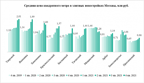 В Тверском районе Москвы средняя цена квадратного метра в сегменте элитных новостроек впервые в истории столичного рынка жилья превысила 2 млн рублей, подсчитали аналитики компании «Метриум». Еще в одном районе (Якиманка) аналогичный показатель достиг 1,99 млн рублей. В целом же цена в элитных новостройках Москвы в среднем выросла за год на 46% до 1,43 млн рублей за метр.