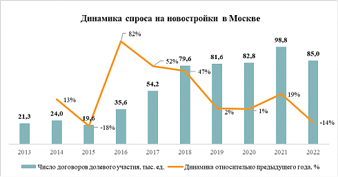 В целом за 12 месяцев Росреестр Москвы зафиксировал 85 тыс. сделок со строящимся жильем в столице. В 2021 году спрос дольщиков оценивался в 98,8 тыс. ДДУ, то есть в 2022 году этот показатель сократился на 14%. Это худшая динамика с 2015 года, когда количество сделок в этом сегменте упало на 18% относительно результатов 2014 года.