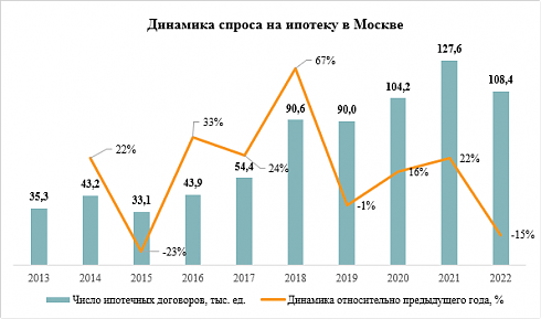 В целом за 2022 год Росреестр Москвы зарегистрировал 108,4 тыс. ипотечных сделок, что на 15% меньше, чем по итогам 2022 года, когда было зафиксировано 127,6 тыс. ипотечных сделок. За последние семь лет это худший показатель, не считая 2015 года, когда количество выданных кредитов уменьшилось относительно 2014 года на 23%.