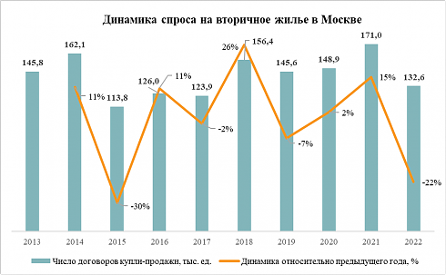 В целом за 2022 год на вторичном рынке зафиксировано 132,6 тыс. сделок, что на 22% меньше, чем в 2021 году, когда зарегистрировали 171 тыс. соглашений. В последний раз сопоставимое снижение активности покупателей было в 2015 году. Тогда спрос сократился на 30% относительно результатов 2014 года.