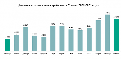В октябре 2023 года Росреестр Москвы зарегистрировал 12,1 тыс. договоров участия в долевом строительстве жилья (ДДУ), что на 11% меньше, чем в сентябре, но в 2,6 раза больше, чем в октябре 2022 года. Несмотря на небольшую коррекцию по сравнению с предыдущим месяцем, текущий октябрьский показатель активности максимальный для этого месяца за всю историю наблюдений. Предыдущий рекорд был в октябре 2021 года, когда Росреестр Москвы зарегистрировал почти 10 тыс. ДДУ.