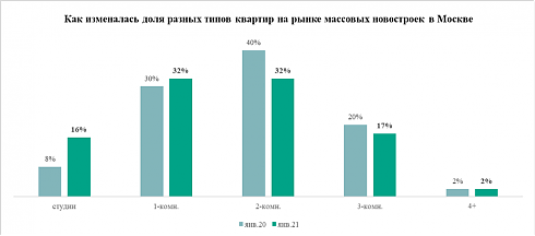 Аналитики «Метриум» отмечают, что сокращение средней площади квартиры на рынке массовых новостроек Москвы может быть связано со структурными изменениями предложения. За прошедший год заметно выросла доля небольших квартир, тогда как представительство просторных вариантов жилья уменьшилось. Так, доля студий в структуре предложения увеличилась за 12 месяцев с 8% до 16%, однокомнатных квартир – с 30% до 32%. При этом доля двухкомнатных квартир снизилась с 40% до 32%, трёхкомнатных – с 20% до 17%.