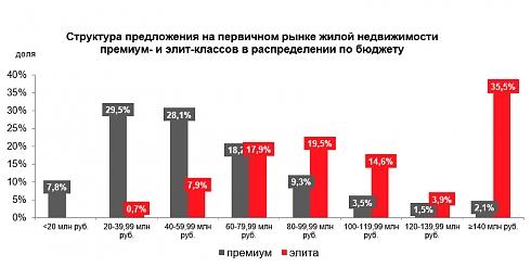 В элитном сегменте преобладающая доля предложения представлена в бюджете от 140 млн рублей (35,5%). При этом элит-класс в большей степени представлен квартирами от 90 до 170 кв. м – 60,2% (в прошлом квартале показатель составлял 55,7%).