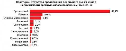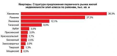 Основная часть квартир элитного сегмента сосредоточена в районе Хамовники – 36,3% от общего объема предложения. Существенные показатели также отмечены в районе Раменки, где находится 27,2% новостроек высокого ценового класса, и Якиманка с показателем 12,1%.