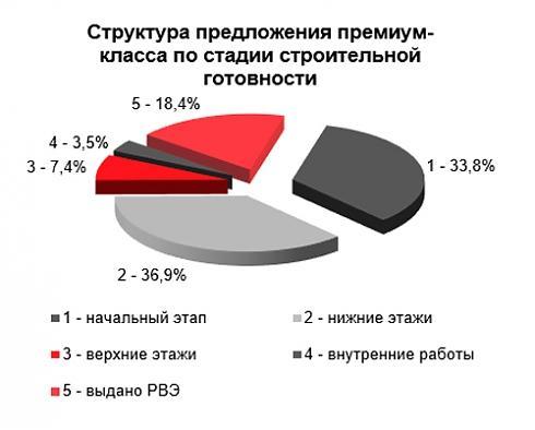 В премиум-классе 70,7% предложения составляют квартиры в корпусах на начальном этапе и на этапе возведения нижних этажей. Новостройки, уже введенные в эксплуатацию, занимают 18,4%.
