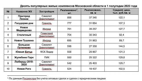 Аналитики департамента проектного консалтинга компании Est-a-Tet проанализировали спрос на новостройки в Московской области за первое полугодие 2020 года и выяснили, какие направления и новостройки пользовались наибольшей популярностью у покупателей. По данным специалистов, за полгода в Московской области было реализовано 1,13 млн кв. м квартир и апартаментов (24,6, тыс. сделок).