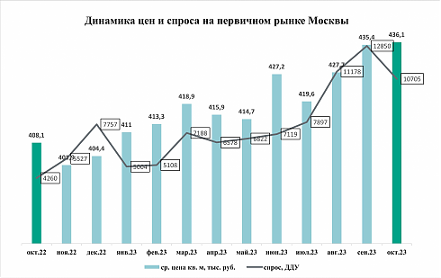 Рост цен на московские новостройки ускорился. За прошедшие 12 месяцев средняя стоимость квадратного метра в новостройках Москвы (во всех классах, а также включая локальный рынок Новой Москвы) выросла с 408,1 тысяч рублей до 436,1 тысяч рублей. Таким образом, новое жилье в столице за год подорожало на 6,9%, подсчитали эксперты компании «Метриум». В свою очередь, рост цен с октября 2021 года по октябрь 2022 года составил всего 4,9%. Вместе с тем вырос и спрос: в октябре 2023 года клиенты первичного рынка столицы совершили 10 705 сделок по ДДУ, что на 151,3% больше, чем годом ранее.