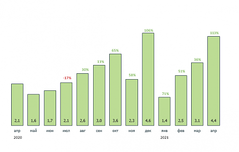 Выход новых проектов на рынок превосходит показатели годовой давности уже девятый месяц подряд. Всего с августа 2020 года по апрель текущего запущено 27,4 млн кв. м многоквартирного жилья (+58% к аналогичному периоду прошлого — позапрошлого годов).
