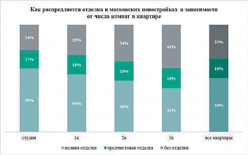 По подсчетам аналитиков «Метриум», с предчистовой и чистовой отделкой продаются 76% студий в Москве – это самая высокая доля квартир под ключ на рынке. Между тем реже всего с отделкой реализуются трехкомнатные квартиры – только 59% от общего числа. Чем меньше квартира, тем больше шансов найти её с отделкой от застройщика.
