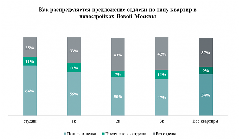 На рынке Новой Москвы прослеживается такая же тенденция, как и в «старой» Москве. Здесь чаще всего на полный или предчистовой ремонт от застройщика могут рассчитывать покупатели самых компактных квартир – студий. В 64% таких квартир запланирована полная отделка и еще в 11% – предчистовая (в сумме 75%). Соответственно без отделки 25% студий.