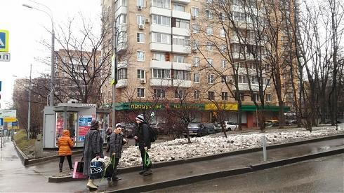 Сразу за переходом будет видно офис продаж ЖК, собственно по улице Петра Алексеева, перпендикулярной к Можайскому шоссе, идет путь к строительной площадке. Здесь же около автобусной остановки еще один продуктовый магазин.