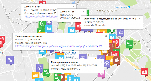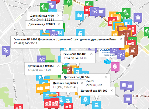 На сайте есть также описание инфраструктуры окрестностей, включая детские сады, школы, гимназии и развивающие центры.