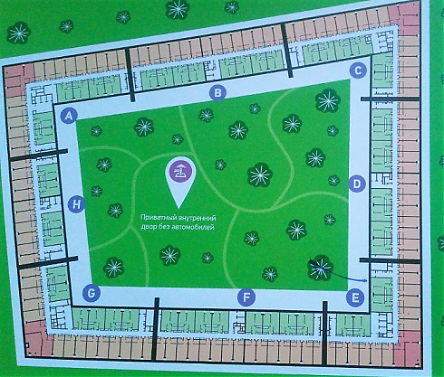 Секции разделены внешними переходными лоджиями, которые выходят во двор. У каждой секции – своя дверь на лоджию и свой набор ключей, так что свободного сквозного прохода по всему периметру дома не будет. Кстати, наличие переходных лоджий, на мой взгляд, полезно для тех, кто будет жить в студиях: с лоджии вы сможете посмотреть, что творится во дворе, если там, например, играют ваши дети. Двор будет закрыт от посторонних, машин в нем тоже не будет, так что создастся довольно безопасная среда, и детей среднего и старшего возраста можно будет отпускать на прогулку одних.