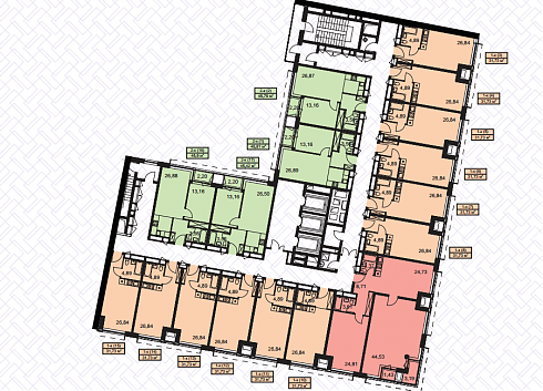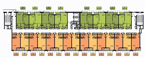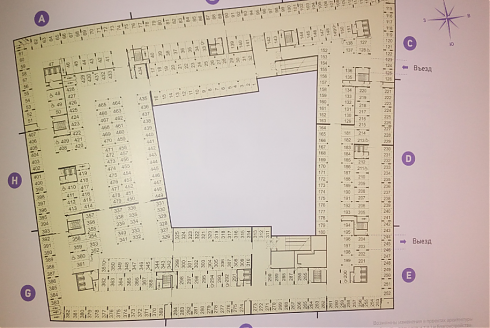 Апартаменты в обоих корпусах – это, главным образом, студии и так называемые евродвушки. Все студии выходят окнами на внешние стороны четырехугольного корпуса, все двухкомнатные апартаменты – во двор.