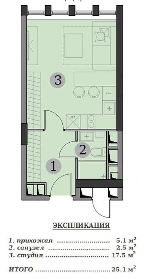 Студии (выделены зеленым цветом). Впервые вижу в такой небольшой площади сразу четыре окна (вернее, окошка) на одной довольно узкой стене! Студии одной планировки, отличаются немного метражом. Приличная прихожая, где вполне встает шкаф, санузел крошечный, ванную не поставить, только душ.