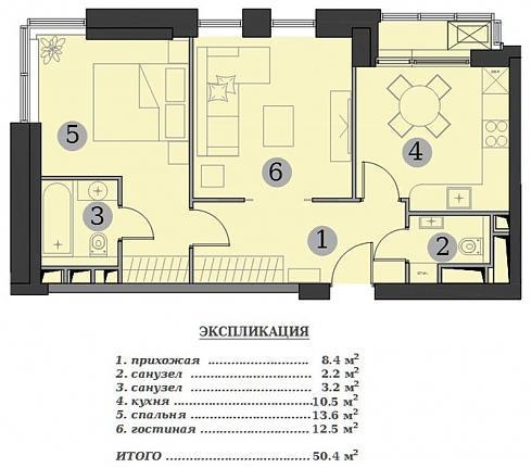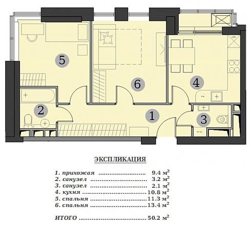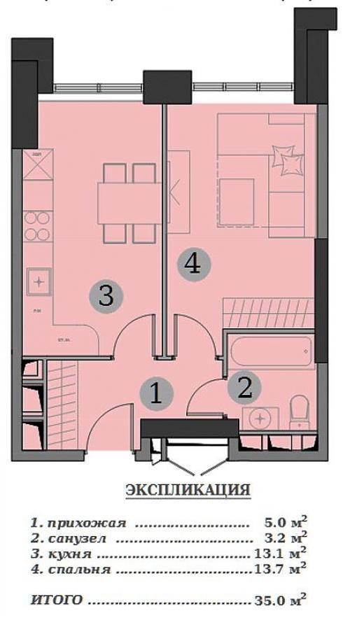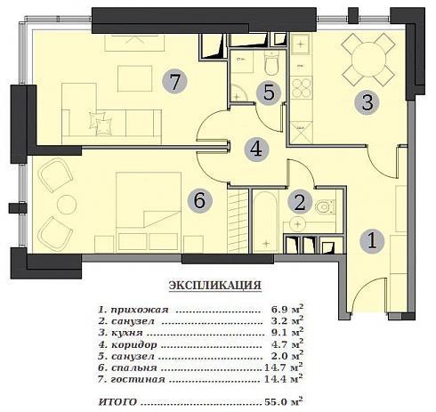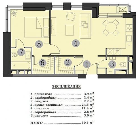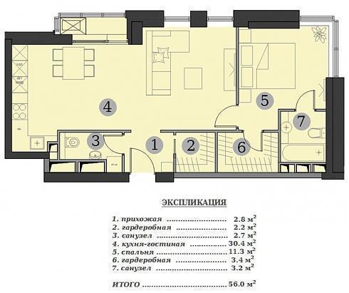 Мне больше понравилось такое предложение. Изолированная спальня с собственным санузлом и гардеробной и большая кухня-гостиная. На экспликацию особо внимания не обращайте, там почему-то под номером 3 написана кухня-гостиная, хотя на самом деле, это туалет. Хотя я знаю, почему – это просто опечатка со сдвоенным номером 2.