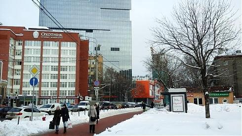 Немного по ходу об инфраструктуре. Слева коричневое с белым здание – это гостиница и деловой центр «Охотник», далее выглядывает кусочек бывшей АТС, сейчас там общежитие.