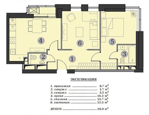 - Двухкомнатные 54,1–61,1 кв. м, стоимостью от 9 571 600 до 10 981 000 рублей.