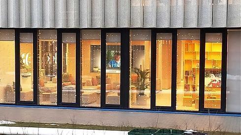 Входные группы с панорамным остеклением с двумя входами обустроят на уровне земли. Предусмотрено место для работы консъержа, будет гостевой санузел, колясочные, велосипедные и лапомойки для домашних животных.
