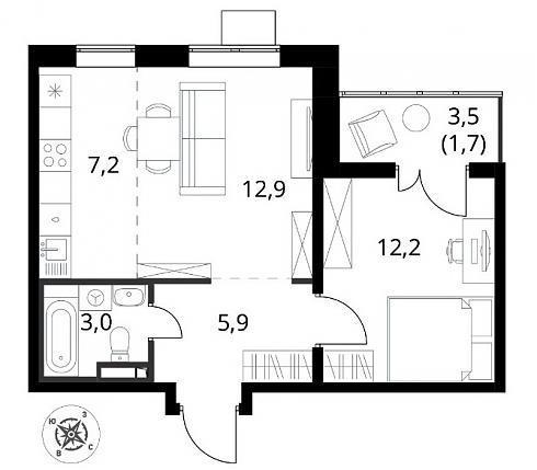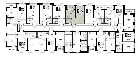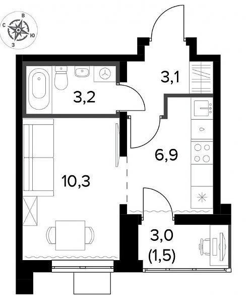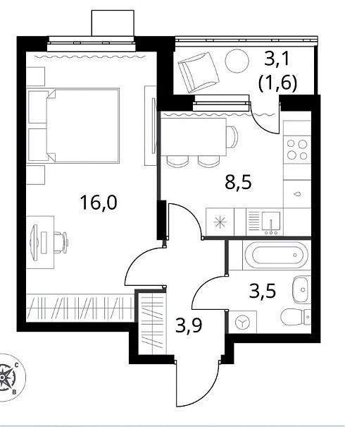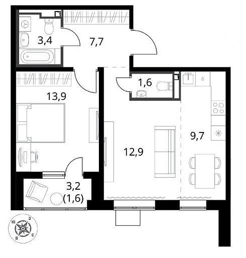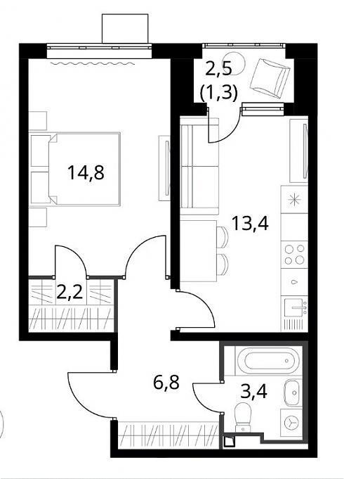 Однокомнатные квартиры располагают входной зоной площадью от 3,21 до 6,9 кв.м., совмещенным санузлом площадью от 3,2 до 3,5 кв.м., кухней площадью от 6,9 до 13,4 кв.м. и спальней площадью от 10,3 до 16,0 кв.м. Имеются лоджии площадью от 2,5 до 3,1 кв.м., встречаются гардеробные площадью 2,2 кв.м.