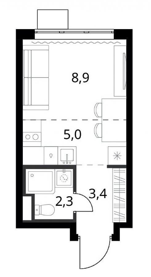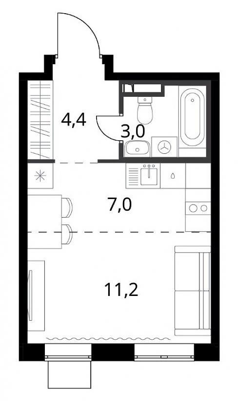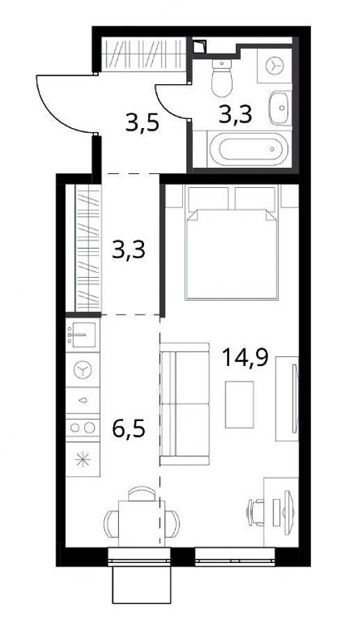 Планировка студий предусматривает входную зону площадью от 3,4 до 4,4 кв.м., совмещенный санузел площадью от 2,3 до 3,3 кв.м., универсальное помещение площадью от 13,9 до 24,7 кв.м.