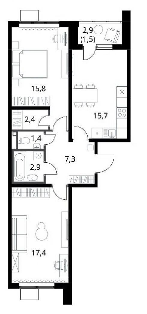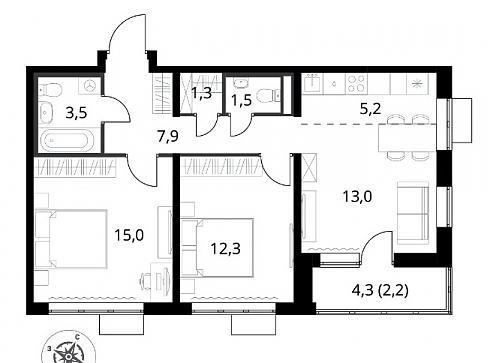 Двухкомнатные квартиры оснащены входной зоной площадью от 5,9 до 7,7 кв.м., одним или двумя санузлами с площадью помещений от 1,4 до 3,4 кв.м., кухней площадью от 20,1 до 22,6 кв.м. в евровариантах планировок и 15,7 кв.м. в классике. Также есть одна или две спальни площадью от 12,2 до 17,4 кв.м. и еще лоджия площадью от 2,9 до 3,5 кв.м., встречается гардеробная площадью 2,4 кв.м. Расположение окон одно- и двухстороннее.