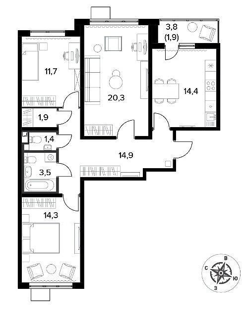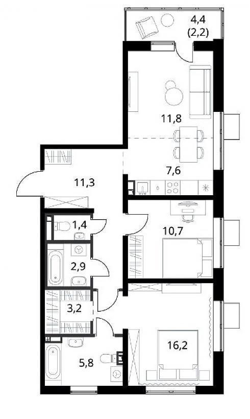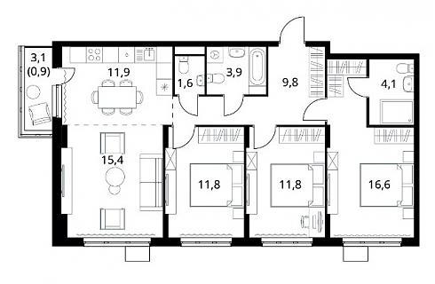 Трехкомнатные квартиры оснащены входной зоной площадью от 7,9 до 14,9 кв.м., двумя или тремя санузлами с площадью помещений от 1,4 до 3,5 кв.м., кухней площадью 14,4 кв.м. и кухней-гостиной в евро вариантах площадью от 18,2 до 19,4 кв.м., двумя или тремя спальнями площадью от 10,7 до 20,3 кв.м. Встречается лоджия площадью от 3,8 до 4,3 кв.м. и гардеробная площадью от 1,3 до 3,2 кв.м. Расположение окон одностороннее, двухстороннее и угловое.