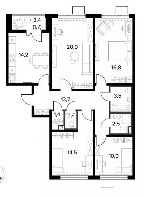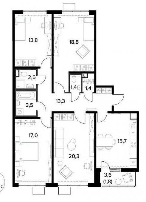 Четырехкомнатные квартиры наделены входной зоной площадью от 9,8 до 13,7 кв.м., тремя санузлами с площадью помещений от 1,4 до 4,1 кв.м., кухней площадью от 14,2 до 15,7 кв.м. в классическом формате и 27 кв.м. в евроварианте планировки, тремя или четырьмя спальнями площадью от 10,0 до 20,3 кв.м. Имеется лоджия площадью от 3,1 до 3,6 кв.м., встречается гардеробная площадью 1,4 кв.м. Расположение окон угловое и двухстороннее. Есть мастер-спальни.