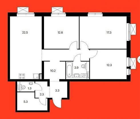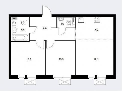 Трехкомнатная квартира тоже может быть спроектирована в двух форматах - классическом и евро. Входная зона от 8,9 до 10,7 кв.м., но если учесть все внутренние коридоры, то общая площадь дойдет до 12,5 кв.м. Санузлы либо раздельные, либо два полноценных, площадь помещений от 1,5 до 3,9 кв.м. Кухни площадью от 14,1 до 22,5 кв.м., а если это евро-вариант, то площадь объединенной гостиной может составить 23,7 кв.м. Спальни площадью от 10,9 до 17,3 кв.м., в том числе и с двумя окнами. А также кладовые площадью от 2,0 до 5,3 кв.м.