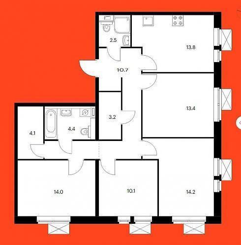 У просторной четырехкомнатной квартиры входная зона 10,7 кв.м., два полноценных санузла площадью 2,5 и 4,4 кв.м. Кухня площадью от 13,8 кв.м., спальни площадью от 10,1 до 14,2 кв.м., две кладовые (или гардеробные) площадью 3,2 и 4,1 кв.м. Есть спальня с двумя окнами.