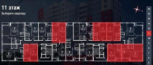 Что касается подбора квартир, то он выполнен в двух вариантах. Можно кликнуть на этаж на виртуальном «макете» комплекса и получить поэтажный план с отмеченными на нем свободными квартирами.