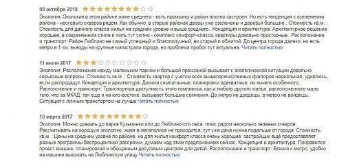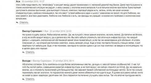 Впрочем, нашлись в сети и любопытные обсуждения. Например, респондентам не удалось достичь согласия в оценке района (и различные мнения на эту тему прочесть всегда полезно). Часть пользователей активно ругают и Люблино, и ЮВАО в целом за плохую экологию, близость промзон и Капотни, другие, напротив, считают, что район не так уж плох, к тому же в нем вполне приличная социальная и дорожная инфраструктура.