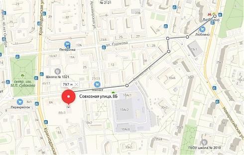 Сам дом находится в сотне метров от перекрестка Совхозной и Краснодонской улиц. Тут можно найти пару торговых точек, фитнес-клуб и даже общественную баню. Сразу за перекрестком есть небольшой сквер.