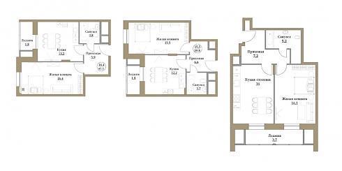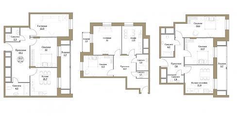 Трешку, расположенную в центре, вполне можно назвать и евро-четырехкомнатной, за счет просторной кухни-гостиной. В остальных двух вариантах запроектировано по две лоджии.