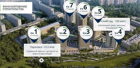 Новостройка будет состоять из семи корпусов башенного типа, в каждом – по 17 этажей. Всего запроектировано 808 квартир, а также 21 коммерческое помещение, 612 машиномест и 215 кладовых в общем на все корпуса стилобате. Кроме того, на территории комплекса будет детский сад на 100 мест.