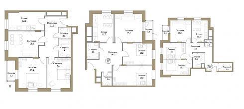 Трехкомнатных тоже богатый выбор – целых шесть вариантов. Прихожие тут весьма приличных площадей, а кое-где есть и гардеробные. Два санузла идут уже «по умолчанию» в каждой квартире.
