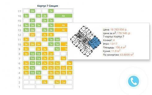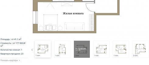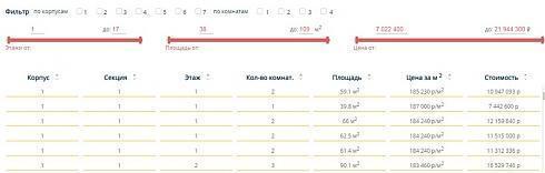 Есть на сайте и инструмент подбора квартир. Результаты выдаются таблицей, в которой можно сортировать квартиры по любому из параметров.